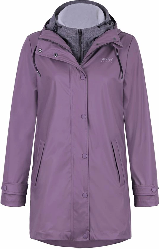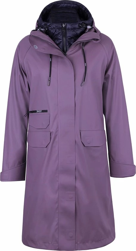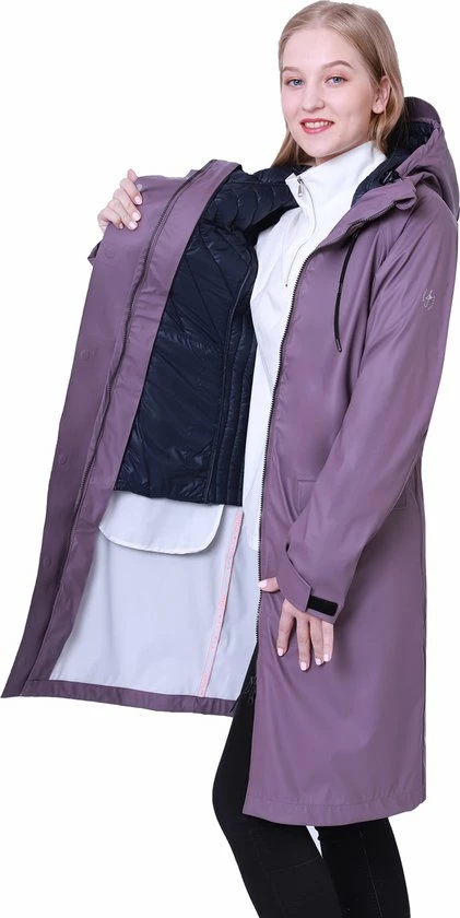 De Vivian regenjas voor dames van Dingy Weather bestaat uit twee delen, namelijk een buitenjas en een binnenjas. De buitenjas is ontworpen uit gerecycleerde PU-stof en 100% polyester. De buitenjas heeft een waterdichtheid van 5000 mm. De waterdichte binnenjas is eveneens gemaakt uit 100% polyester en gevuld met 3M imitatiezijde en katoen. Niet alleen is de jas comfortabel en zacht, maar hij houdt je ook warm tijdens koude winterdagen.