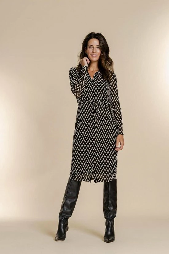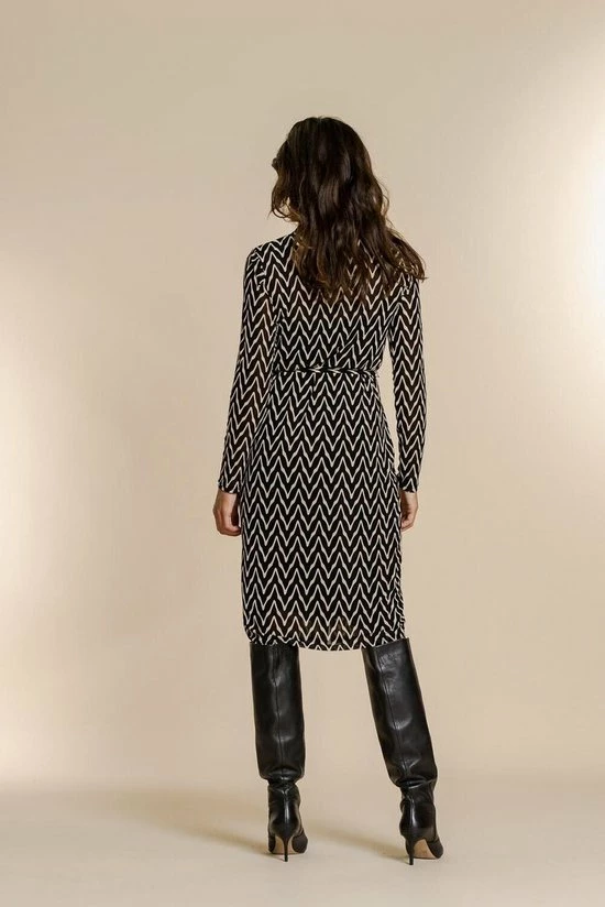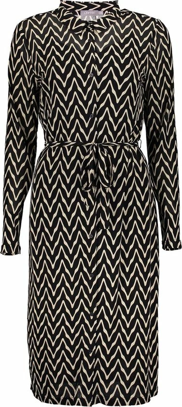Mesh doorknoopjurk van Geisha. Deze midi jurk is uniek door haar stof en het zigzag patroon. Het artikel is voorzien van een onderjurk en een bijpassend ceintuur. De jurk heeft lange mouwen, een puntkraag en een knoopsluiting. De maat S is 110 cm lang.