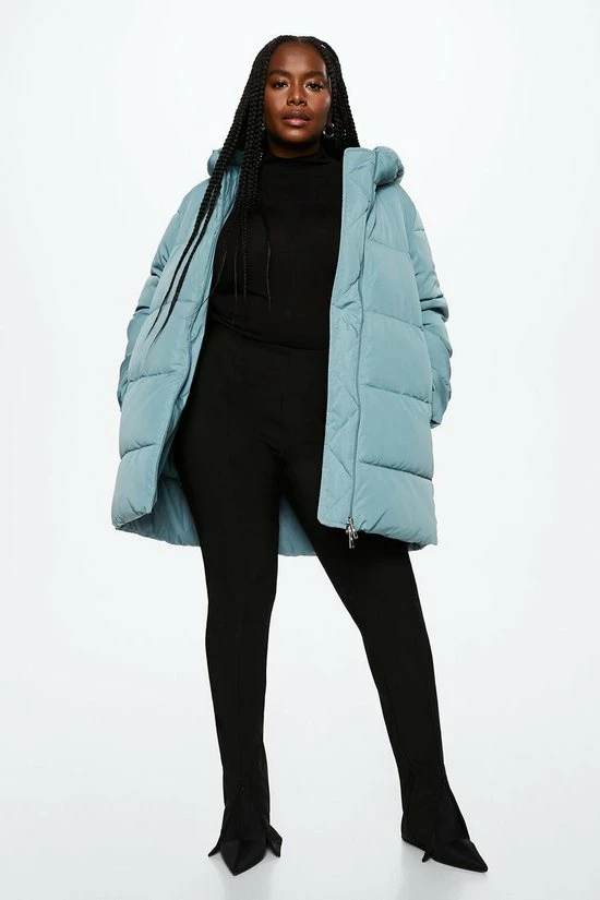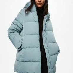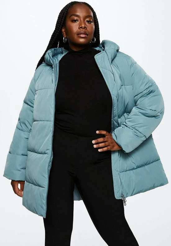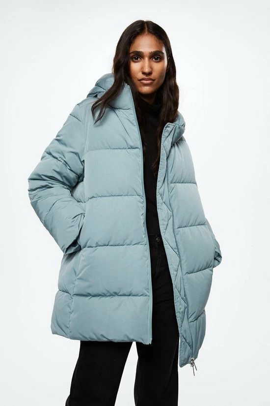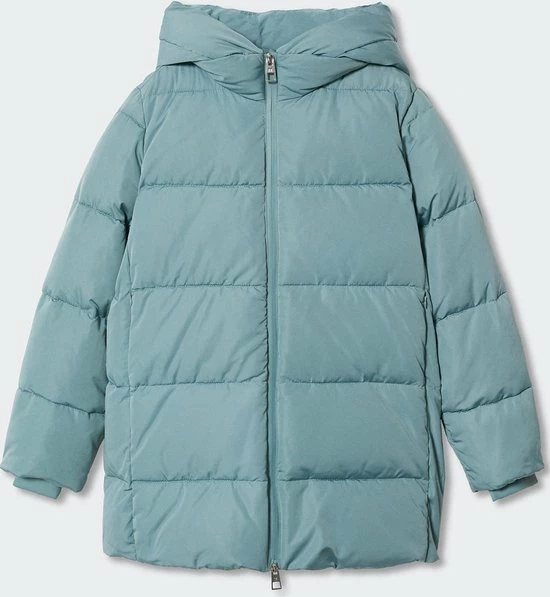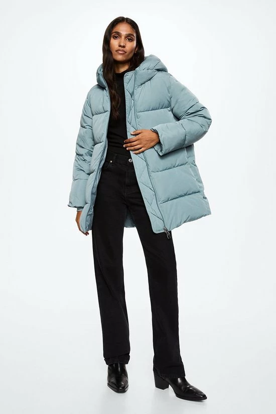Dik gewatteerde winterjas van Mango met lange mouwen en een vaste capuchon. De jas heeft hoge ritszakken met een blinde ritssluiting. De jas sluit met een two way ritssluiting.