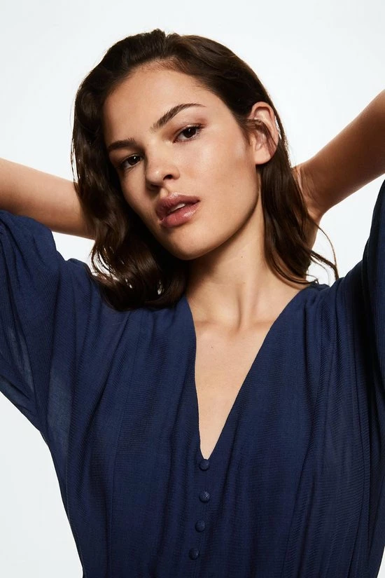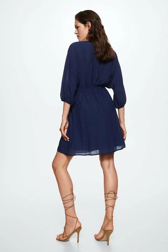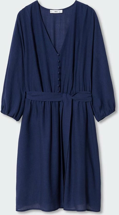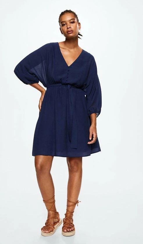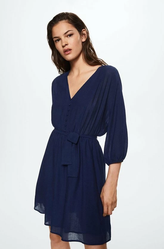 Korte jurk van Mango met driekwart mouwen met een elastische boord. Dit model heeft een V-hals met hieronder een rij decoratieve knopen. Tevens heeft deze jurk een verwijderbare ceintuur. De totale lengte is 88 cm bij maat S.