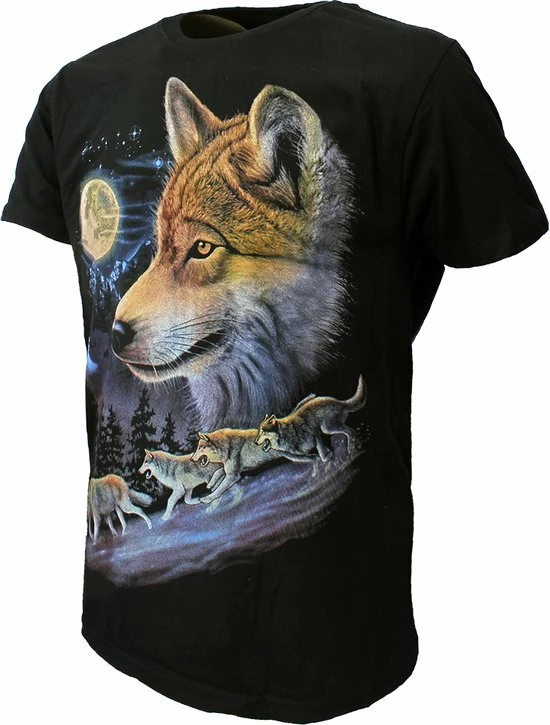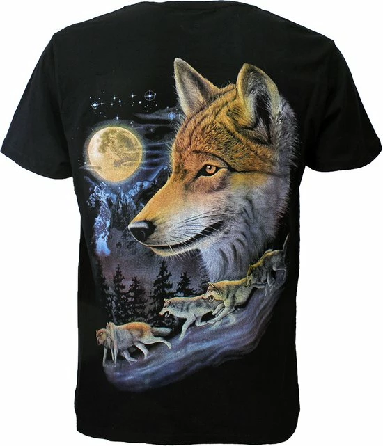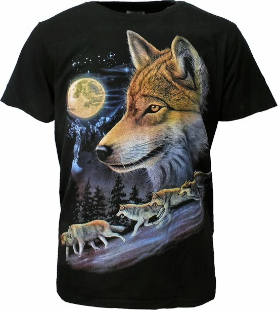 Een super cool T-shirt met een mooie print van wolven bij een volle maan. De print is gezeefdrukt dus deze is van hoogwaardige kwaliteit.