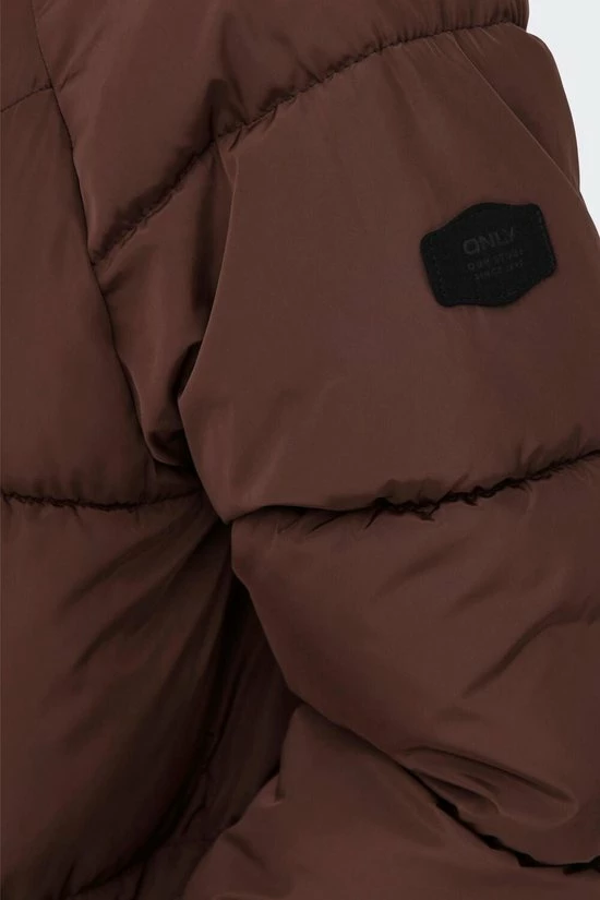 Gewatteerde jas van Only met vaste capuchon. De jas heeft een vulling gemaakt van gerecycled polyester. Dit model met doorgestikte naden heeft een two way zipper en schuine steekzakken aan de voorkant met een drukknoop. De mouwen zijn voorzien van een elastische boord. Onderaan in de zijnaden zitten drie drukknopen voor meer bewegingsvrijheid.