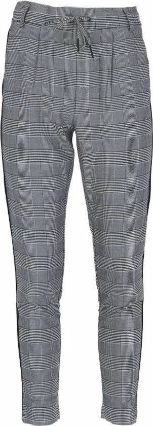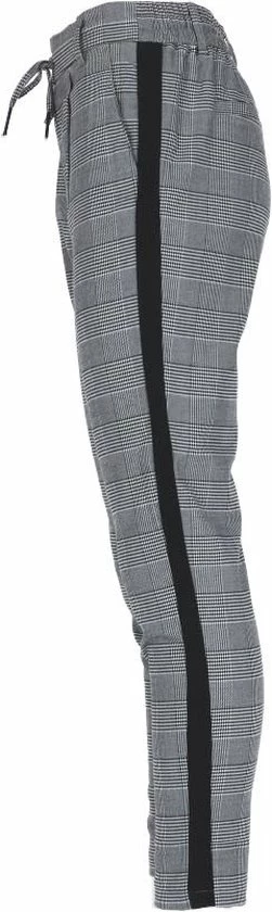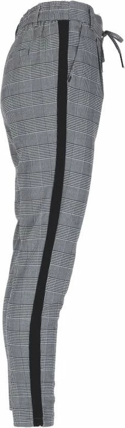 Geruit; Steekzakken; Sierpaspelzakken; Zwarte bies op de zijnaad; Elastische tailleband met aantrekkoord; Riemlussen