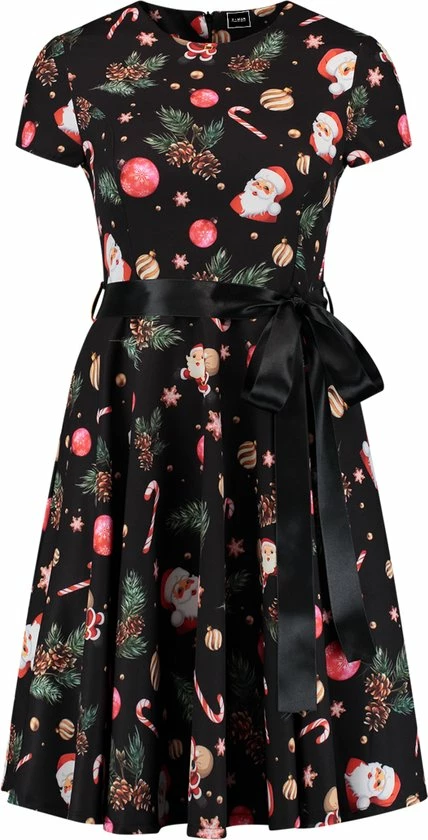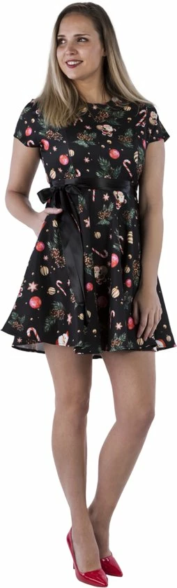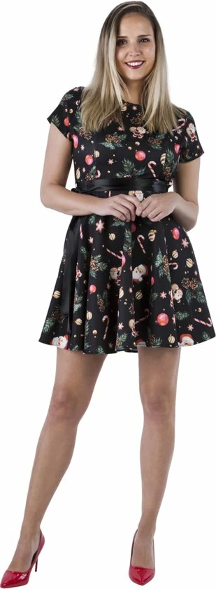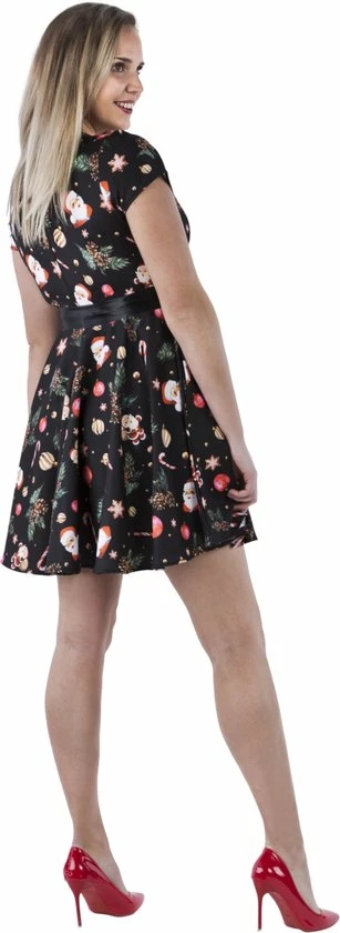 Supervrouwelijke unieke kerstjurkje black santa. Het jurkje is voorzien van unieke plaatjes van denneappels, candy canes en kerstmannetjes. De jurk is voorzien van een zwarte satijnen striklint, waardoor het jurkje een extra chique en feestelijke uitstraling krijgt. Het jurkje heeft een insteekzak en is voorzien van YKK kwaliteits-rits. Het jurkje heeft een volledige klokrok en een uitstekende pasvorm. Het kerstjurkje bestaat voor 85% uit polyester, 10% uit elastaan, voor 5% uit katoen en komen in verschillende soorten en maten waardoor er altijd een kerstjurkje voor jou bij zit!. Deze stijlvolle kerstjurkjes verhogen de feestsfeer thuis, maar ook zeker op het werk of tijdens een kerstborrel!