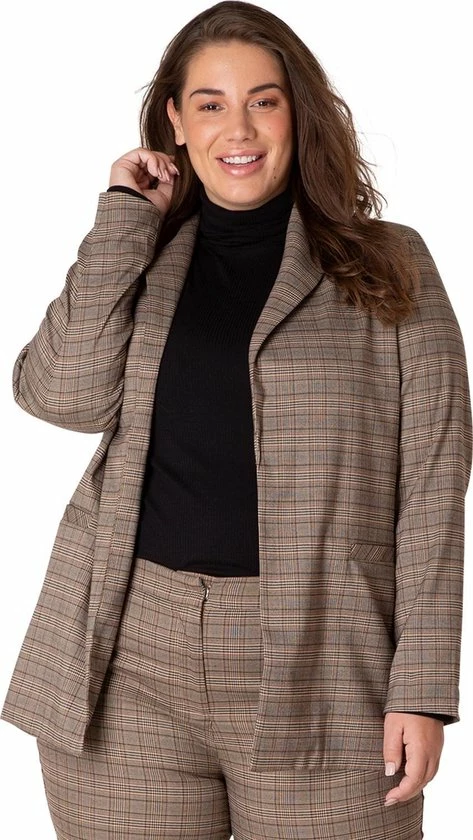 Ruitjes zijn helemaal hot en trending. Yesta heeft hier een losvallend model gemaakt in een getailleerd en iets korter model. De blazer heeft een smalle rever en in het voorpand zitten paspel zakken. De broek in dezelfde ruit is artikel A32775.
